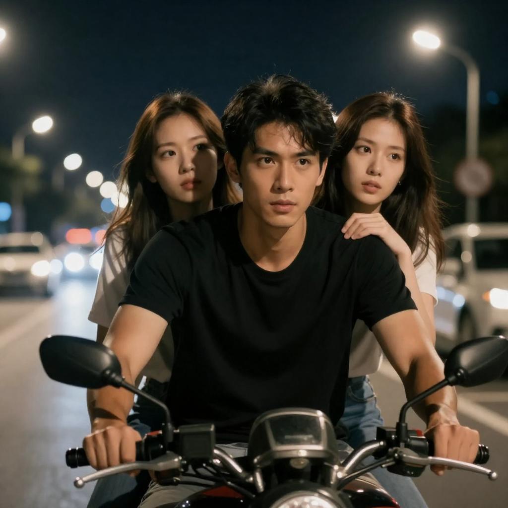 Photograph of two people at night on a motorcycle. Foreground man with dark hair, intense expression, wearing black t-shirt, gripping handlebars. Rear woman with long brown hair, concerned expression, hugging man from behind. Streetlights and blurred car lights in background.