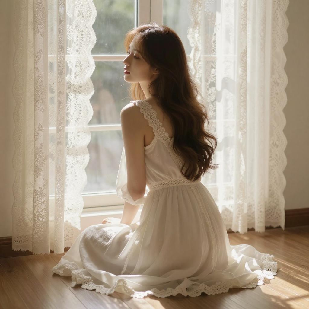 Photograph of a young woman with fair skin and long, dark brown hair in pigtails, sitting on a wooden windowsill. She's wearing an off-the-shoulder, beige knit sweater and no pants, exposing her slender legs. She's looking down with a thoughtful expression, her right hand touching her chin. The background shows a large, slightly dirty window with a blurry, outdoor scene. The room has a rustic, textured white wall.