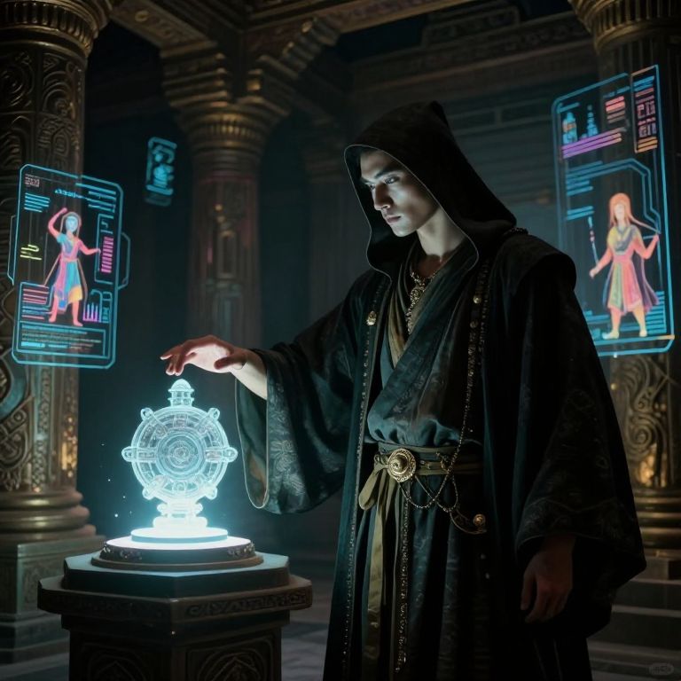 In the enigmatic style of a reimagined Caravaggio masterpiece, FLUX.1 captures a striking scene within an ancient temple. An ethereal figure, reminiscent of a futuristic samurai, stands amidst dimly lit surroundings, his hand extended towards an arcane artifact glowing on a pedestal. Intricate holographic murals adorn the walls, flickering to life with scenes from a bygone cyberpunk era. As the samurai's face is illuminated by the intense glow, dramatic shadows play across his determined expression, creating an atmosphere that is both charged and contemplative - highlighting the weight of the impending decision that will shape the course of this digital age.