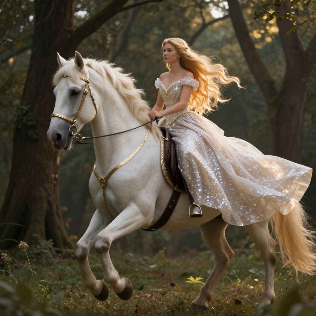 In a captivating, ethereal forest, a stunning woman, reminiscent of Princess Aurora, rides a majestic horse. Her long, golden hair cascades down, catching the light, while her ball gown, adorned with sparkling crystals, flows gracefully around her. The horse, equipped with intricate bridle and saddle, moves with a regal poise, its coat gleaming under the mystical forest's glow. The interplay of light and shadow creates a mesmerizing atmosphere, highlighting the woman's serene expression and the horse's powerful stance. The scene is a harmonious blend of natural beauty and fantasy, with the woman and horse as the central figures, their presence commanding attention amidst the enchanting surroundings.