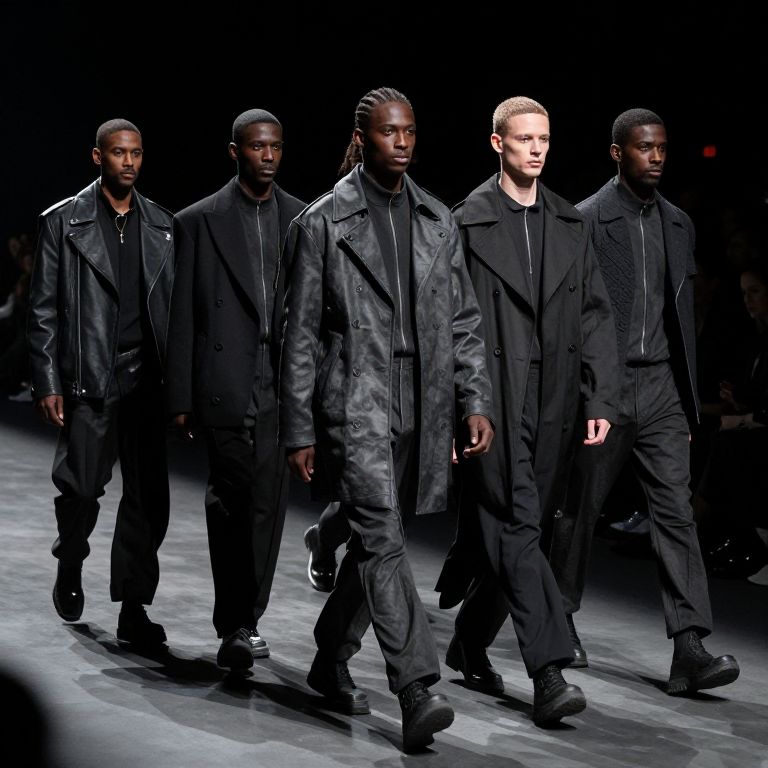 Photograph of a male fashion runway show featuring five Black men walking in a row. They are all dressed in black, with four wearing long, black leather trench coats and one in a black tracksuit. The men have varying hairstyles, from short to braided. The runway is illuminated with a spotlight, casting shadows on the dark floor. The background is black, emphasizing the models and their attire. The men exude a serious, focused demeanor as they walk. The overall style is modern, minimalist, and monochromatic.