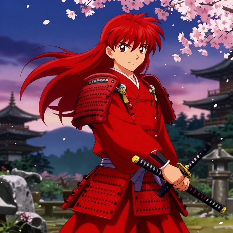 Red anime boy in traditional samurai armor, vibrant red hair flowing in the wind, holding a katana with cherry blossoms falling around him in a serene Japanese garden under a twilight sky.