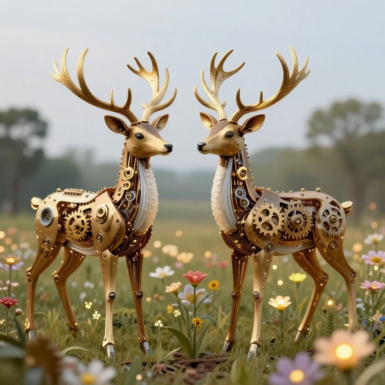 In a surreal tapestry where nature and machinery intertwine, clockwork deer adorned with golden antlers stand serenely amidst a field of luminous, mechanical flowers, their gears whispering a hymn to the delicate balance of life and artifice.