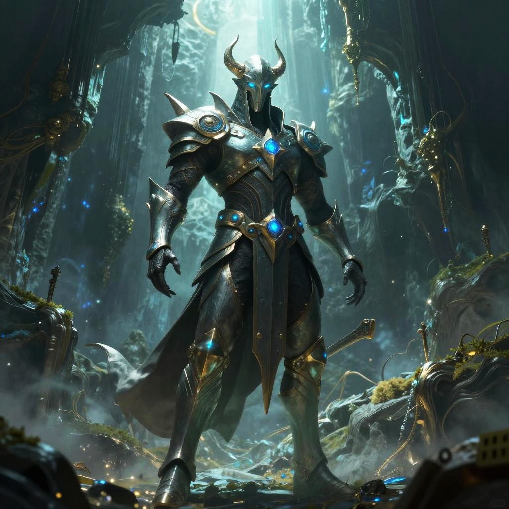 Digital art of a dark, imposing armored figure with glowing blue gem, horned helmet, and spiked shoulders standing in a misty, rocky cave illuminated