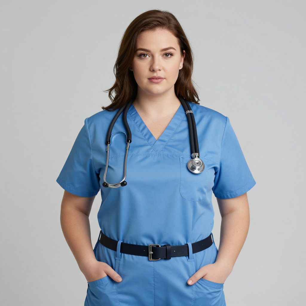 "plus size doctor scrubs, stethoscope, solo, hands in pockets, realistic, belt, doctor, looking at viewer, brown hair, male focus, nurse, 1girl, blue shirt, short sleeves Realistic photo of casual sexy person with pretty face"