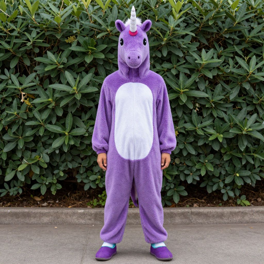 Photograph of a person standing on a concrete sidewalk, wearing a purple, plush, unicorn onesie with a white chest patch. The onesie has a small, pointed, white horn on the head and purple, padded hands and feet with blue socks peeking out. The person's face is not visible as it is covered by the hood. The background features dense, green, leafy bushes. The image has a bright, colorful, and playful vibe, emphasizing the whimsical costume. The texture of the onesie appears soft and fuzzy.