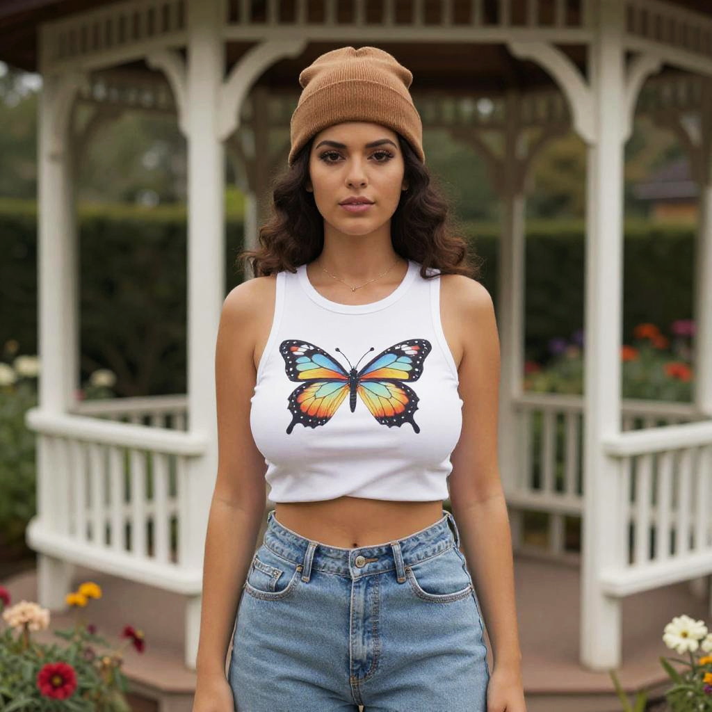 Photograph of a young woman standing in front of a white wooden gazebo with a brown roof. She has olive skin, dark wavy hair, and wears a brown knitted beanie. Her white sleeveless crop top features a large, colorful butterfly print on the chest. She pairs this with high-waisted, light blue denim jeans. The background includes vibrant flowers and greenery. The gazebo has white railings and a slightly blurred, colorful garden. The woman's expression is neutral, and she stands confidently with her hands by her sides. The image has a bright, natural light.