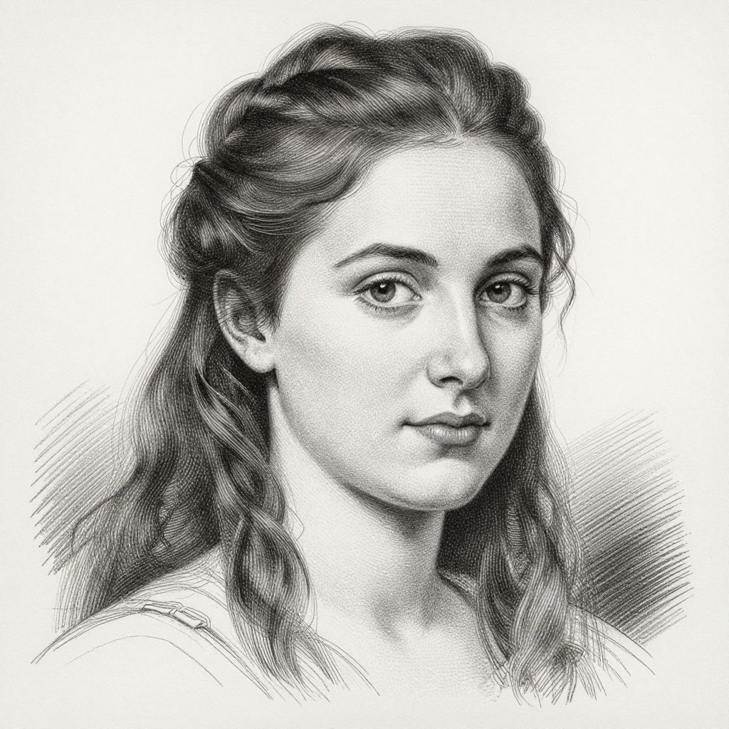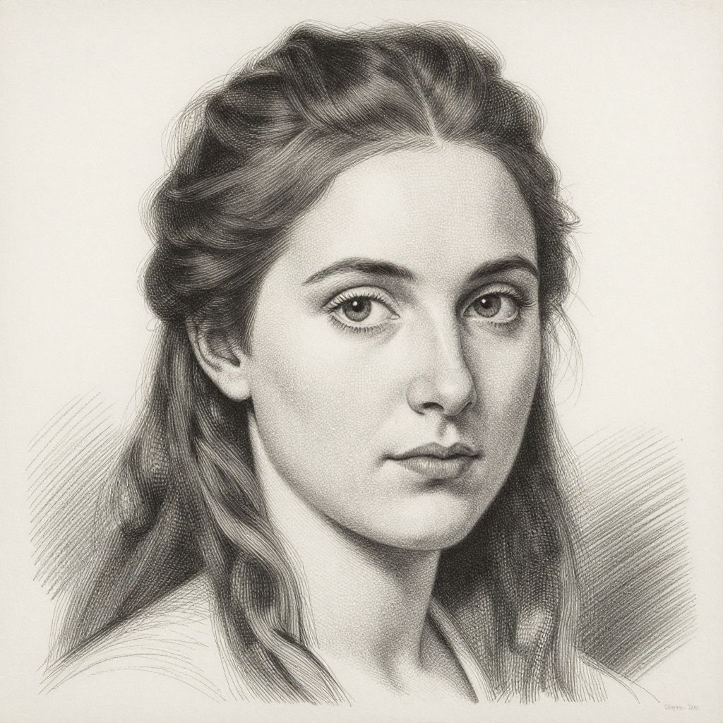 Monochrome ink drawing of a young woman with wavy hair, gentle expression, and soft features, looking slightly to the right.