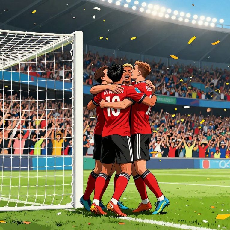 Footballdrawing capturing a triumphant goal celebration, players hugging near the net, confetti flying, stadium filled with cheering fans, energetic atmosphere, bright colors with a semi-realistic comic book style