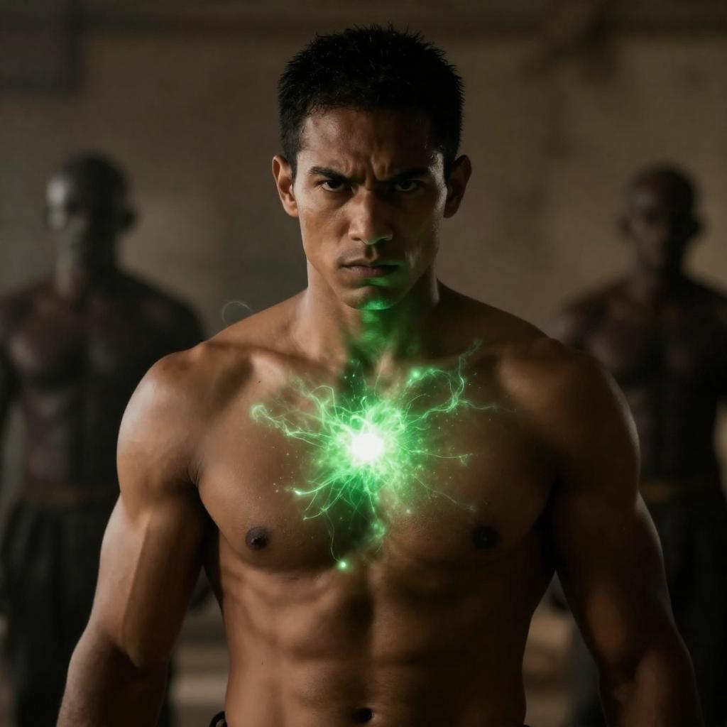 Photograph of two shirtless men with dirty, sweaty skin standing close together outdoors. Both men have short dark hair, muscular builds, and wear dog tags around their necks. Background includes trees and a grassy field. Both men have serious, intense facial expressions. The man on the left has a slightly wider jawline, while the man on the right has a more angular face.