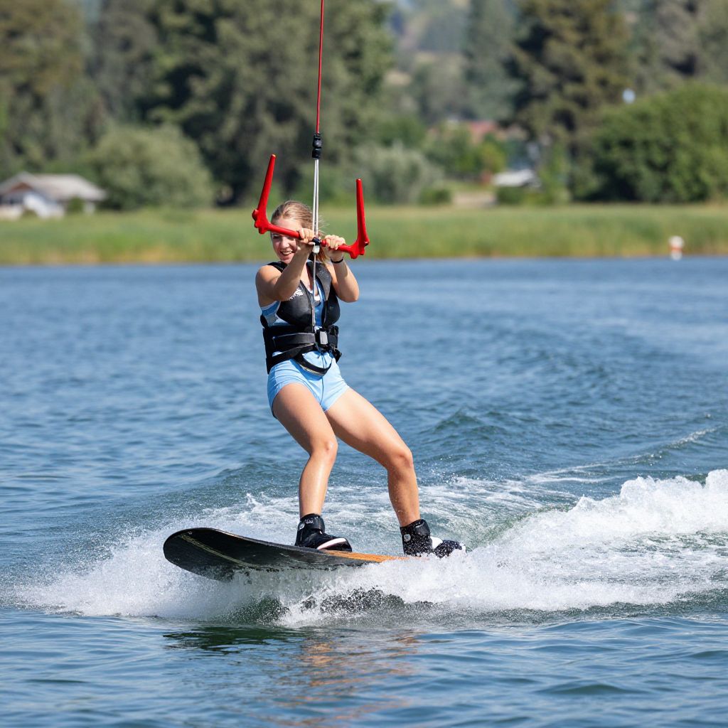 A young woman wakeboards gracefully across the calm waters of The Preserve at Gotham Bay in Coeur d'Alene, Idaho, holding onto red control bars connected by taut lines, her smile reflecting the sunny day amidst a backdrop of lush green trees.