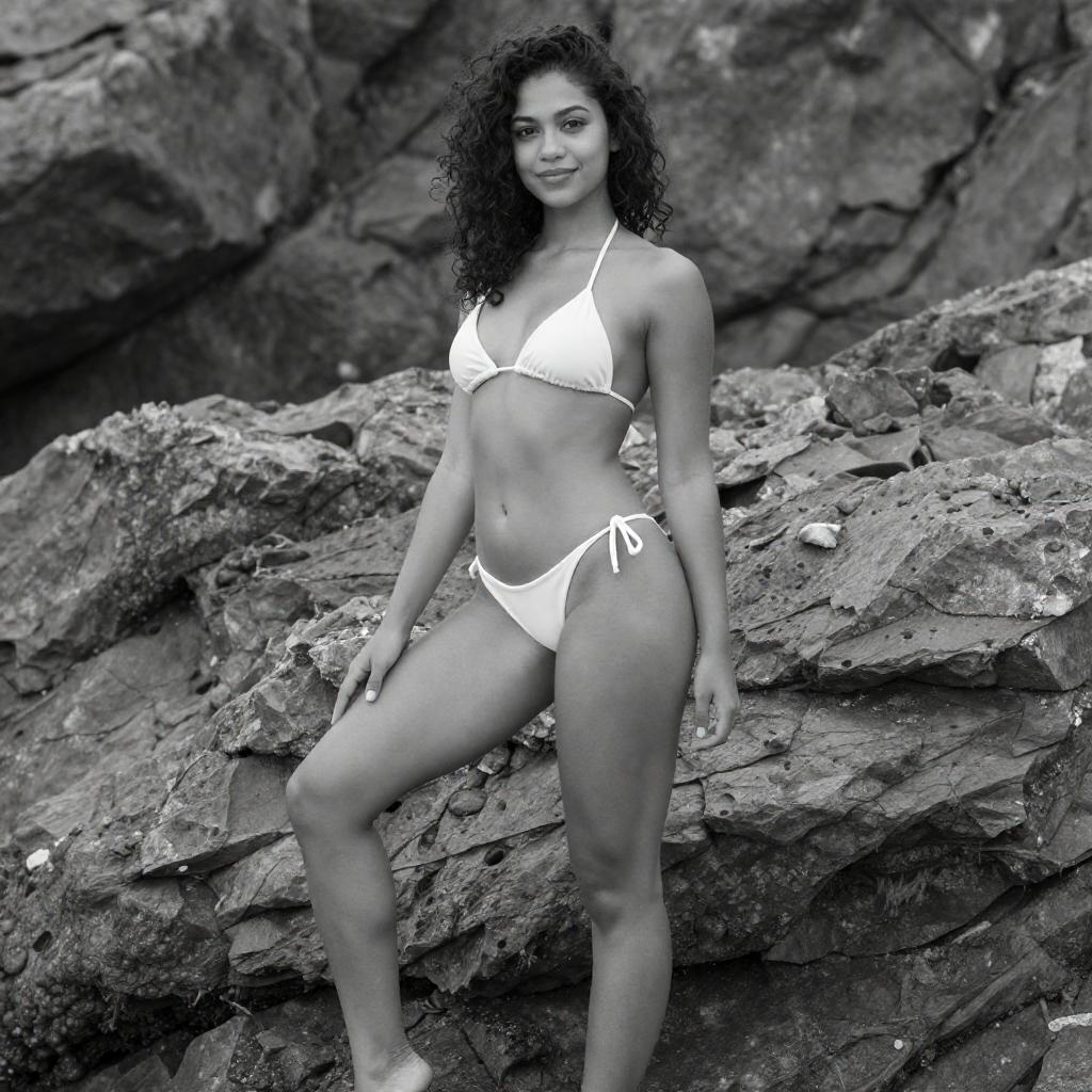 Black-and-white photograph of a young woman with curly dark hair, wearing a white bikini, standing confidently on rocky terrain. She has a slim, toned physique and is smiling slightly. The rocky background is ured and uneven, with large rocks surrounding her. Her right leg is slightly forward, and her left arm rests by her side.