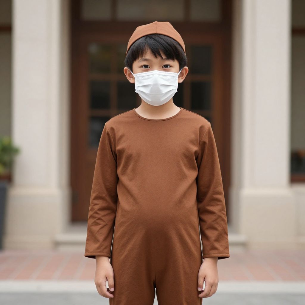 Muffin Boy Costume, man in a brown outfit and a mask standing in front of a building
