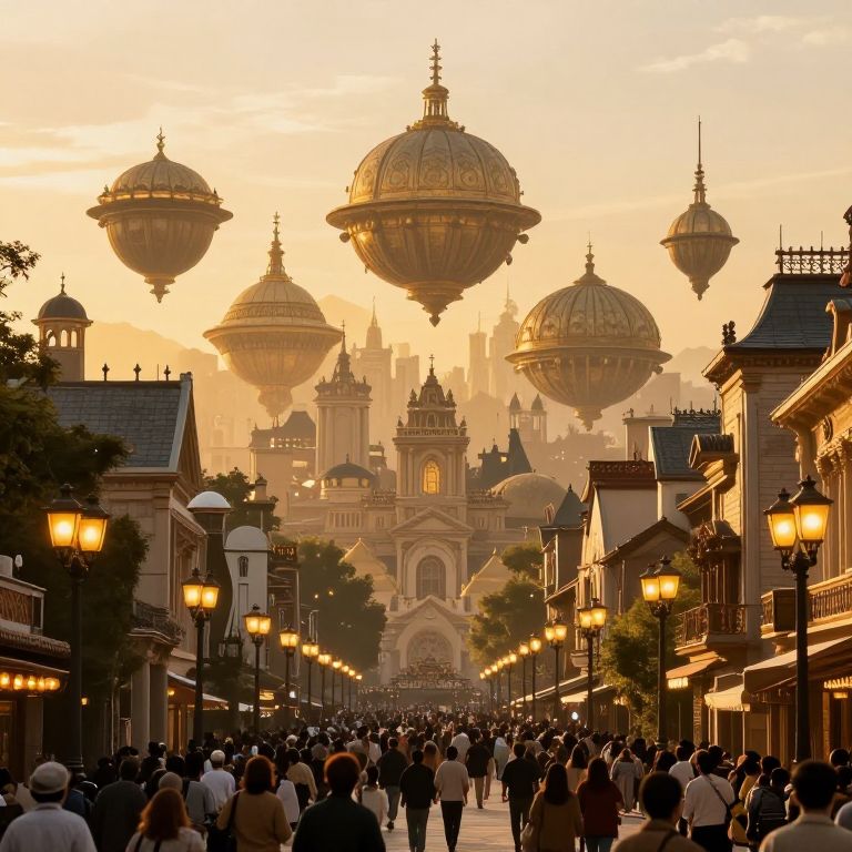 Photograph of a bustling Disney-like street at sunset, filled with people, surrounded by ornate buildings and floating, golden-hued airships.
