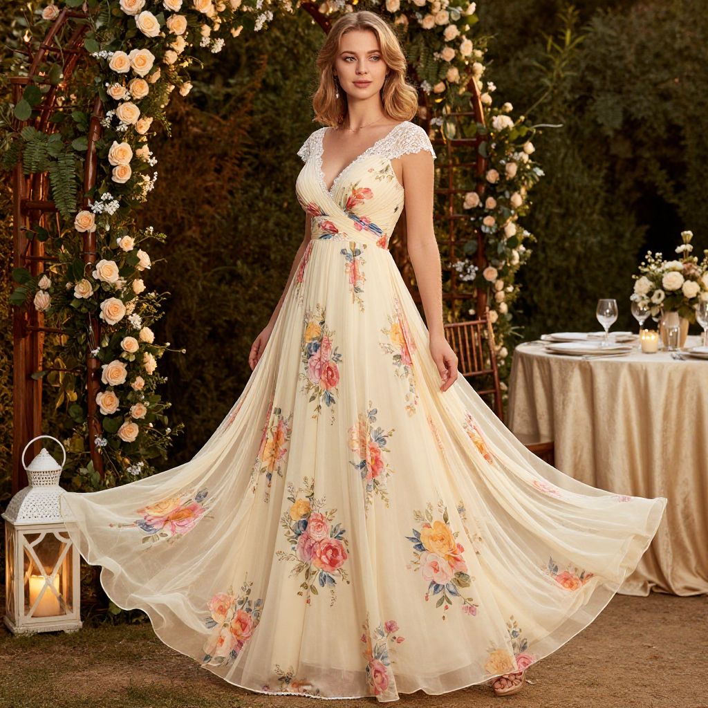 A beautiful young woman with soft blonde hair and bright blue eyes is dressed in a radiant chiffon party wear gown at a garden-themed wedding reception. The gown flows like water, with a floral pattern woven into the fabric and delicate lace trim. She stands near a vintage floral arch under warm golden lighting, surrounded by blooming roses and lanterns. The setting is lush and warm, with a soft breeze causing the chiffon to gently flutter.. The woman has big tits and cute face