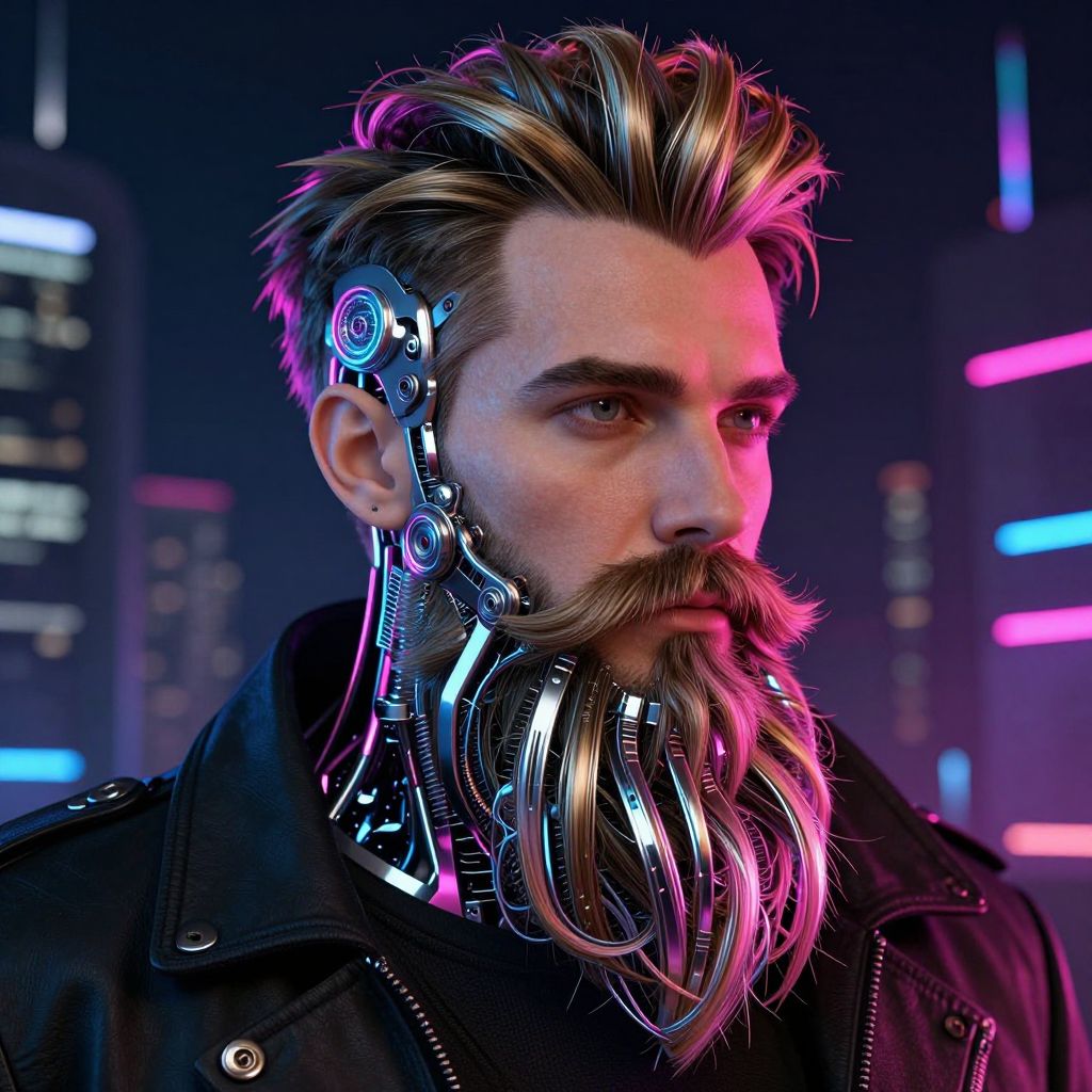 Tipo barba creative digital art featuring a futuristic man with a cybernetic styled beard, metallic strands interwoven with natural hair, neon colors and dark cityscape background, cyberpunk theme, highly detailed and vibrant.