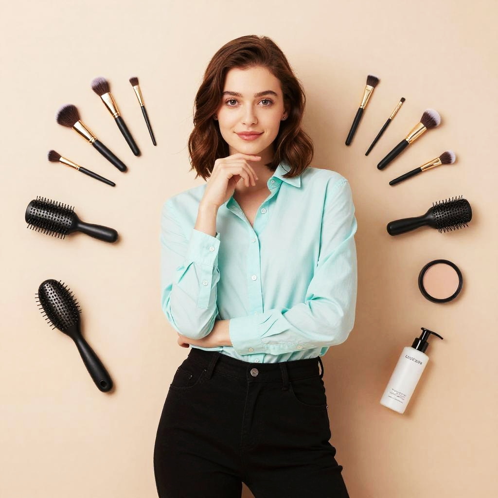 Photograph of a fair-skinned woman with shoulder-length brown hair, wearing a light blue button-up shirt and black high-waisted pants. She stands against a beige background, smiling with her right hand lightly touching her chin. Surrounding her are various makeup brushes with black handles, a black hairbrush, a pink makeup sponge, and a white bottle of nail polish. The brushes are arranged in a circular pattern behind her, creating a symmetrical design. The image has a bright, clean aesthetic with high contrast and vivid colors.