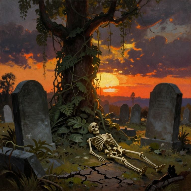 This digital artwork depicts a spooky graveyard at sunset. A human skeleton lies on cracked ground in the foreground, surrounded by overgrown grass and ferns. Two weathered tombstones, partially obscured by vines, stand on either side of a large, twisted tree. The sky is ablaze with vibrant orange, red, and purple hues, casting a dramatic light over the scene. Other smaller, shadowy tombstones are visible in the background, blending into the twilight. The overall mood is eerie and haunting, with a rich, dark color palette and detailed textures emphasizing the decay and desolation of the setting.