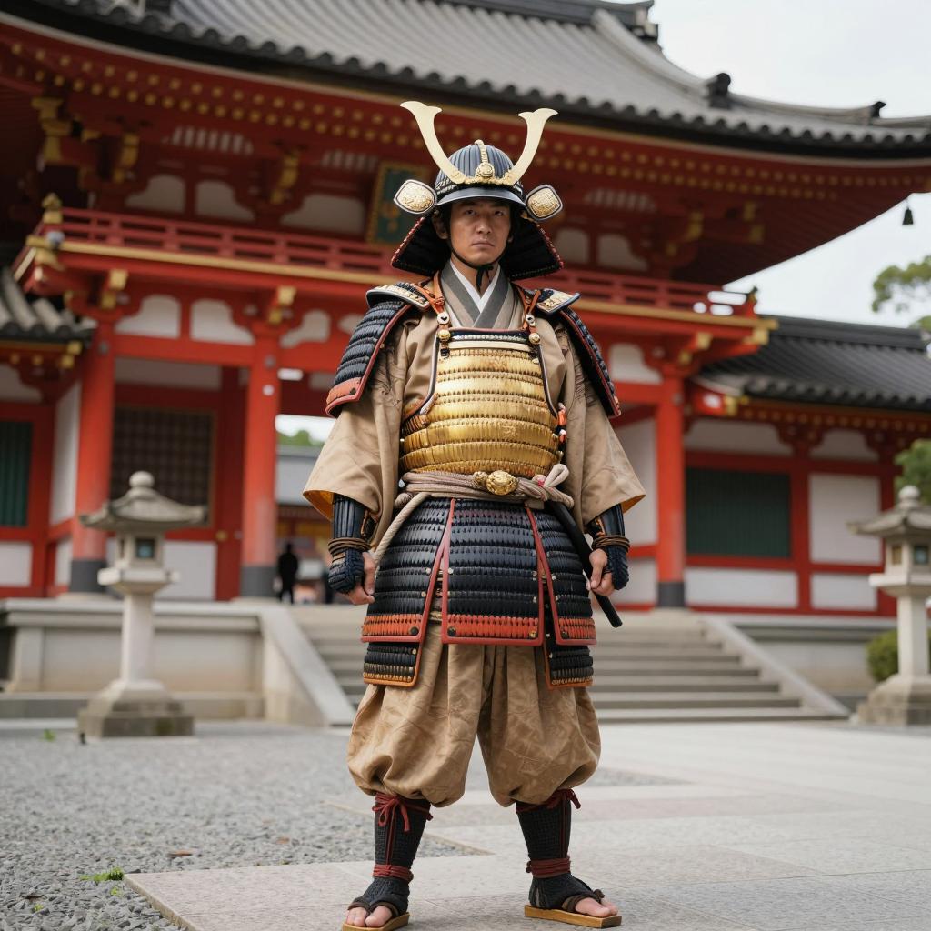 Oni costume, photo of a samurai standing in front of a traditional Japanese temple, daytime, realistic, detailed, traditional samurai armor with gold and black patterns, large horned helmet, serious expression, tan robes with black and gold accents, wooden sandals, temple in background with red and grey walls and intricate roof design, realistic ures, soft natural light, focus on samurai, slight blur in background, historical setting, traditional Japanese architecture
