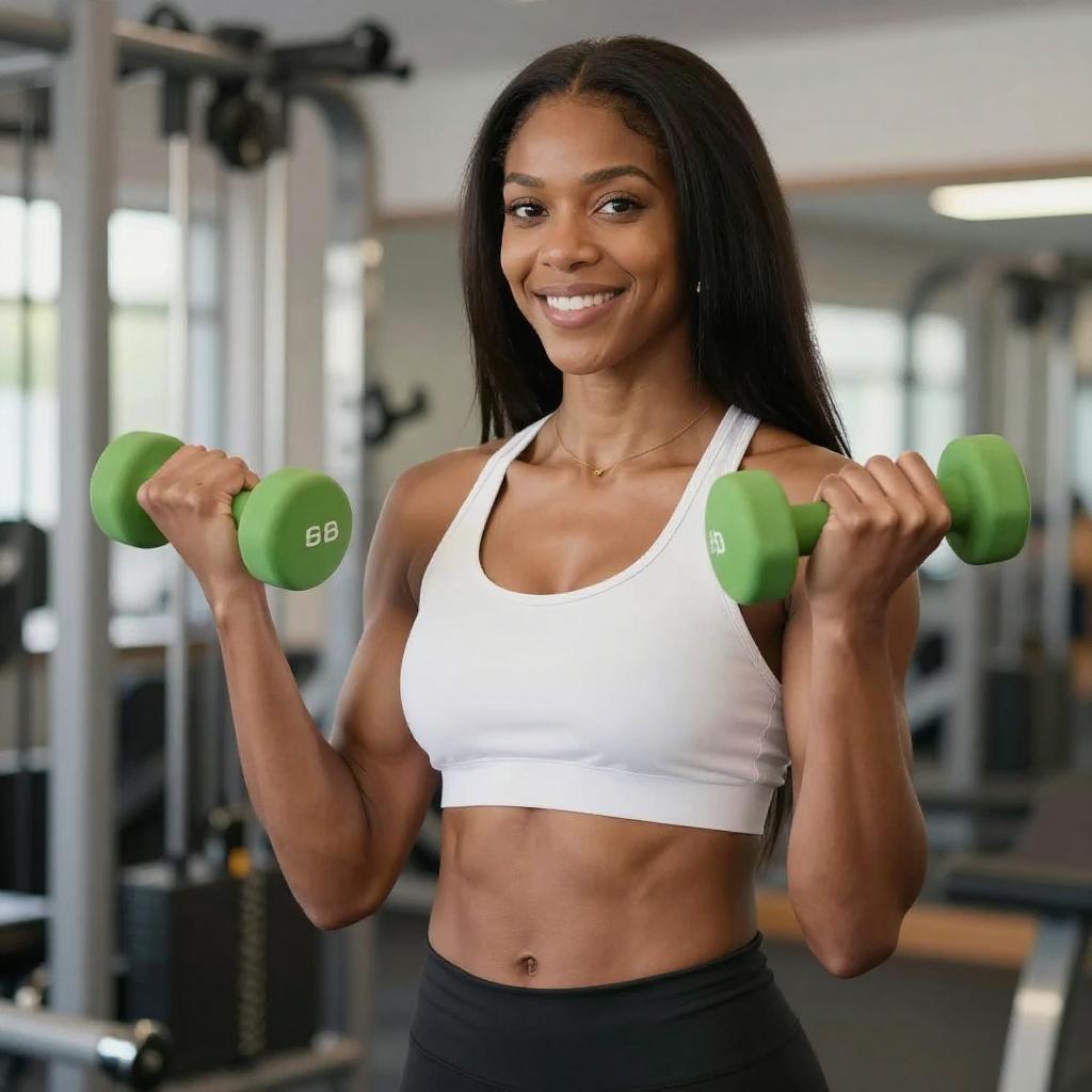 Photograph of a muscular Black woman with dark skin and long black hair, standing in a dimly lit gym. She wears a black sports bra and gray shorts, holding a pair of yellow and black dumbbells. Her defined abs and arms glisten with sweat, highlighting her fitness. The background includes dark ropes and gym equipment.