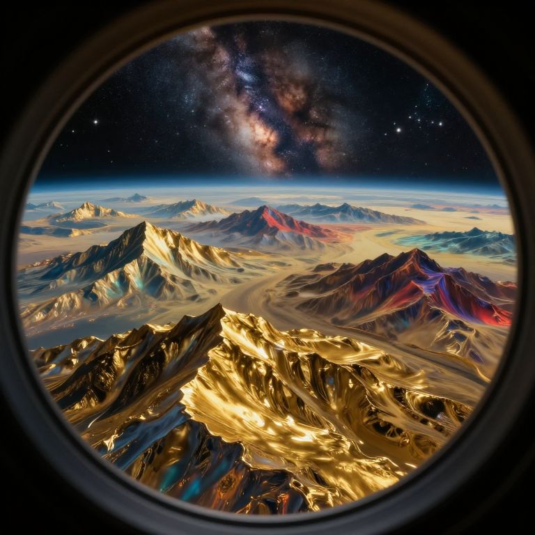 In the surrealistic style reminiscent of Dali's iconic dreamscapes, envision an expansive celestial view captured through an extraterrestrial telescope lens. The image unveils a breathtaking landscape composed of iridescent mountains crafted from liquid gold, which casts radiant hues across the cosmos. This dreamlike panorama stirs emotions of fascination and amazement, beckoning viewers to explore the enigmatic wonders concealed within this high-resolution digital celestial realm.