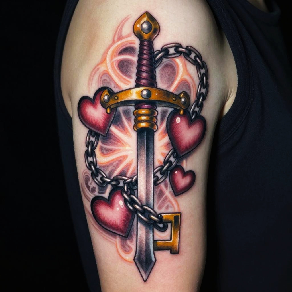 Viking battle tattoos showcasing dramatic scenes of ancient Norse warriors clashing in combat, adorned with mythological symbols like Yggdrasil and Mjolnir, wrapped around the forearm with a mix of shading and line art for a striking visual impact.