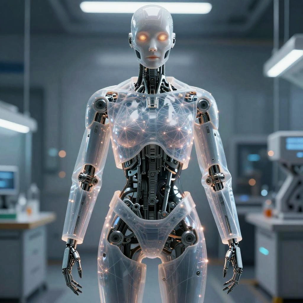 Undress clothes ai visualization, android model with AI neural network patterns showing through semi-transparent garments, intricate mechanical joints, glowing eyes, sci-fi cybernetic laboratory environment, photorealistic style