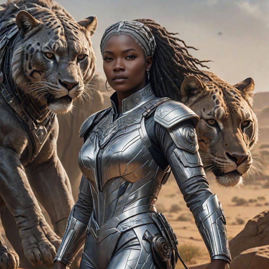 Portrait of a confident African American woman dressed in a sleek silver futuristic suit standing next to an anthropomorphic white tiger warrior in matching metallic armor. Both subjects have a powerful and commanding presence, set against a minimalist gray background.