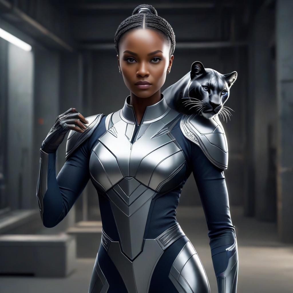 A middle-aged woman in a sleek silver jumpsuit stands with the poise and grace of a panther in a technologically advanced African nation. Her jumpsuit is adorned with the insignia of her organization, her movements are fluid and agile. As she raises her hand, electricity crackles at her fingertips, a testament to her mastery over the elements. This middle-aged woman is a leader, a warrior, and a hero, ready to protect her people with fierce loyalty and strength passed down from her forebears.