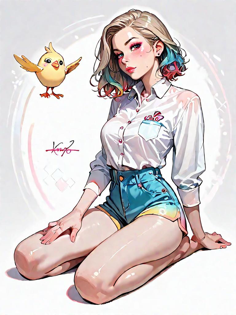 1girl, source_comics, realistic face, full body shot, Woman, chic, sheer white long-sleeve blouse, crew neckline, solid white front panel, embellished colorful trim on shorts hem, high-waisted shorts.