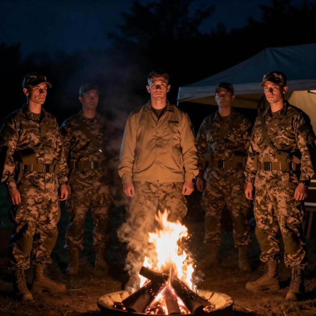 Photograph of a snowy forest scene with four soldiers in camouflage uniforms and helmets. They are crouched around a wounded soldier lying on the ground, tending to his injuries. Bright sunlight filters through the trees, creating a stark contrast with the dark, snow-covered forest floor.