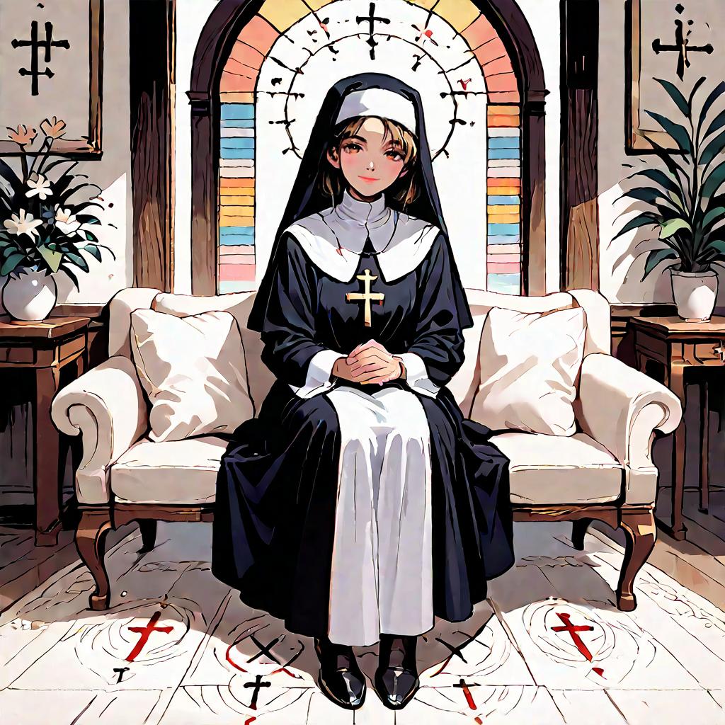 Score_9, score_8_up, score_7_up, source_anime, multiple girls, 1boy, priest, nuns, sitting, full body, smile, looking at viewer, couch, rating_safe
