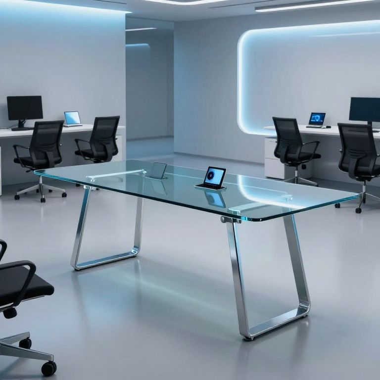 A sleek modern glass table in a futuristic office space, minimalist design with metal legs, surrounded by ergonomic chairs, high-tech gadgets and ambient blue lighting creating a professional and clean environment