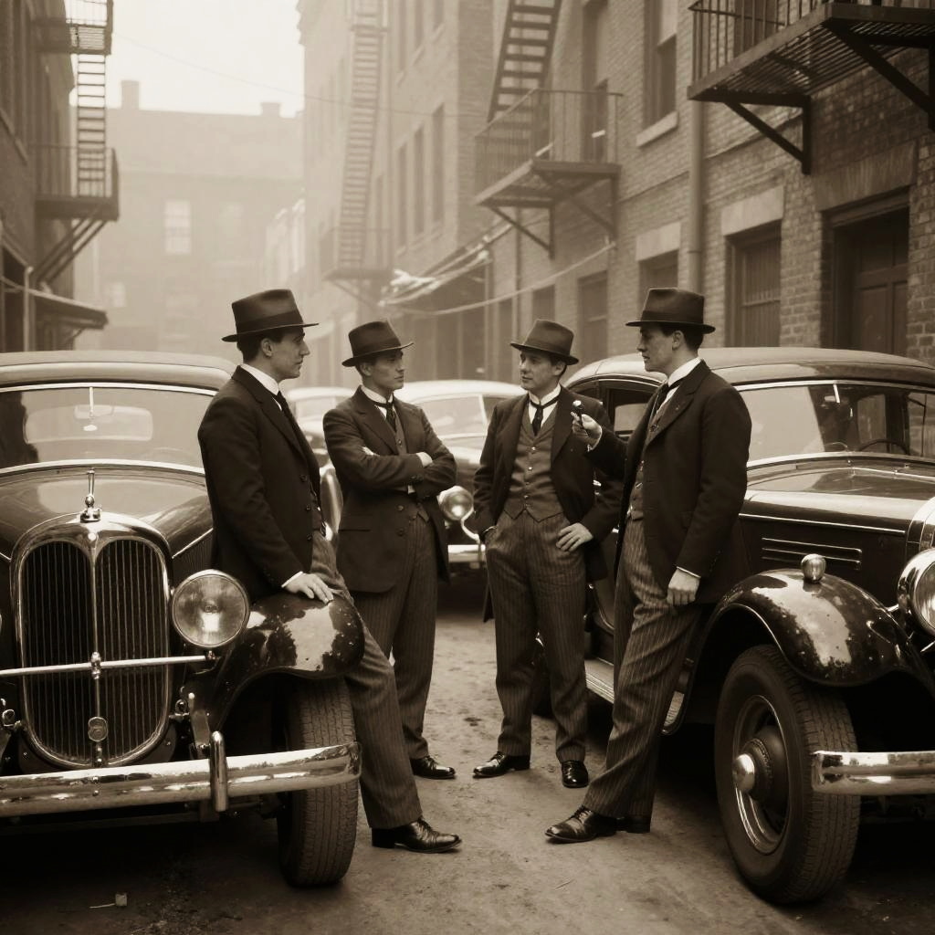 1920s New York gangsters gathered in an alley, vintage cars parked nearby, brick buildings with fire escapes, foggy night, moody shadows, sepia tone photograph effect