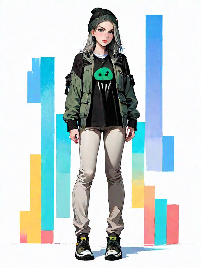 Digital illustration of a young woman in casual streetwear standing against a white background with colorful abstract bars. She wears an olive green quilted bomber jacket over a black hoodie with a green graphic, paired with light gray jogger pants and black sneakers with yellow accents. Her gray hair is topped with a red knit beanie. The style is realistic with a focus on fashion details.