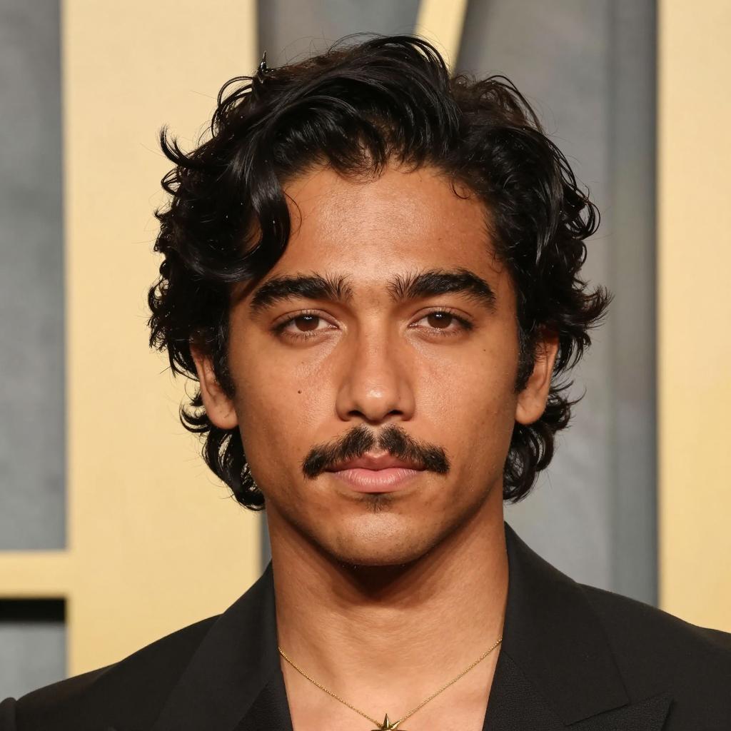 Close-up photorealistic portrait of a young man with medium brown skin and black wavy hair styled in a vintage manner. He has a small mustache, dark eyebrows, and brown eyes with a neutral expression. He is wearing a black blazer and a gold necklace featuring a star pendant. The background is blurred with golden vertical elements and soft lighting enhances the realism of the image.