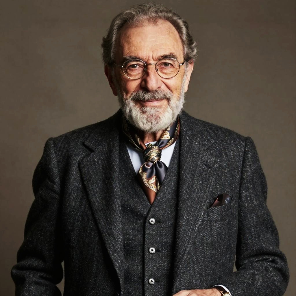 A elderly man with a salt-and-pepper beard, wire-rim glasses, and gentle crow's-feet smile, adorned in a bespoke charcoal three-piece tweed suit with a patterned silk cravat and a visible pocket watch. With a confident smile, he gazes directly at the lens, exuding elegance.