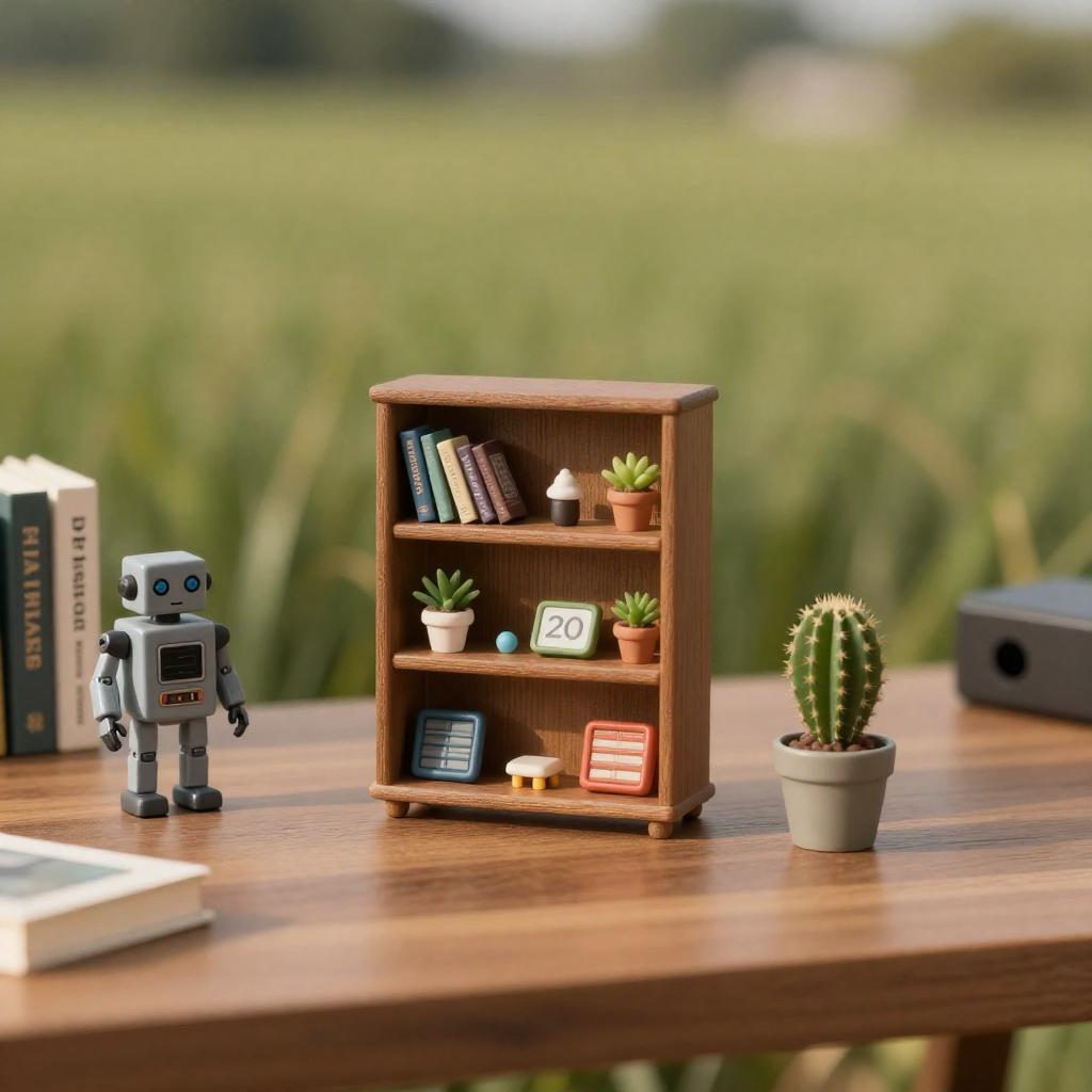 There is a small plant in a small cup on a desk, miniature product photo, product display photograph, short bookshelf, book shelf, book shelf small library, knickknacks, godray on plants, on desk, anthropomorphic cactus, displayed on mahogany desk, a still life of a robot, books on side table, bookshelf, on a desk, realistic, field, photo background, highly detailed, 24mm photograph, film, bokeh, professional, 4k