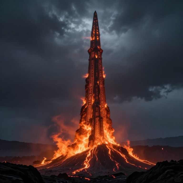Fantasy spire ai: A lone fantasy spire ai pierces through a volcanic landscape, its surface etched with ancient symbols that react to wind and sound. Flames from below dance along its outer walls, creating a mesmerizing interplay of fire and light. A silent storm passes overhead, and the spire hums with an otherworldly resonance.