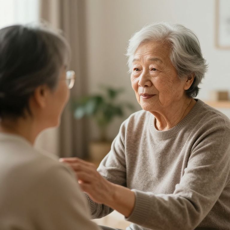 Altenpfleger caring for elderly person in a warm, cozy home setting, soft natural lighting, gentle expressions, detailed textures of clothing and skin, realistic style with compassionate atmosphere