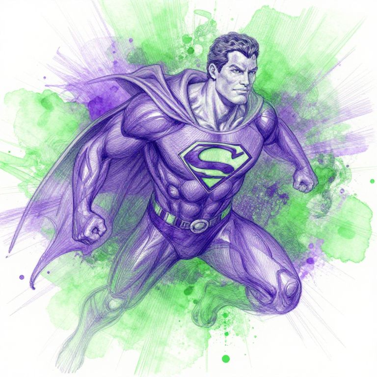 Fill superhero, bright colours, purple green abstrack, pencil drawing, abstract, surrealism, hyper detail, line art, watercolour splashes,