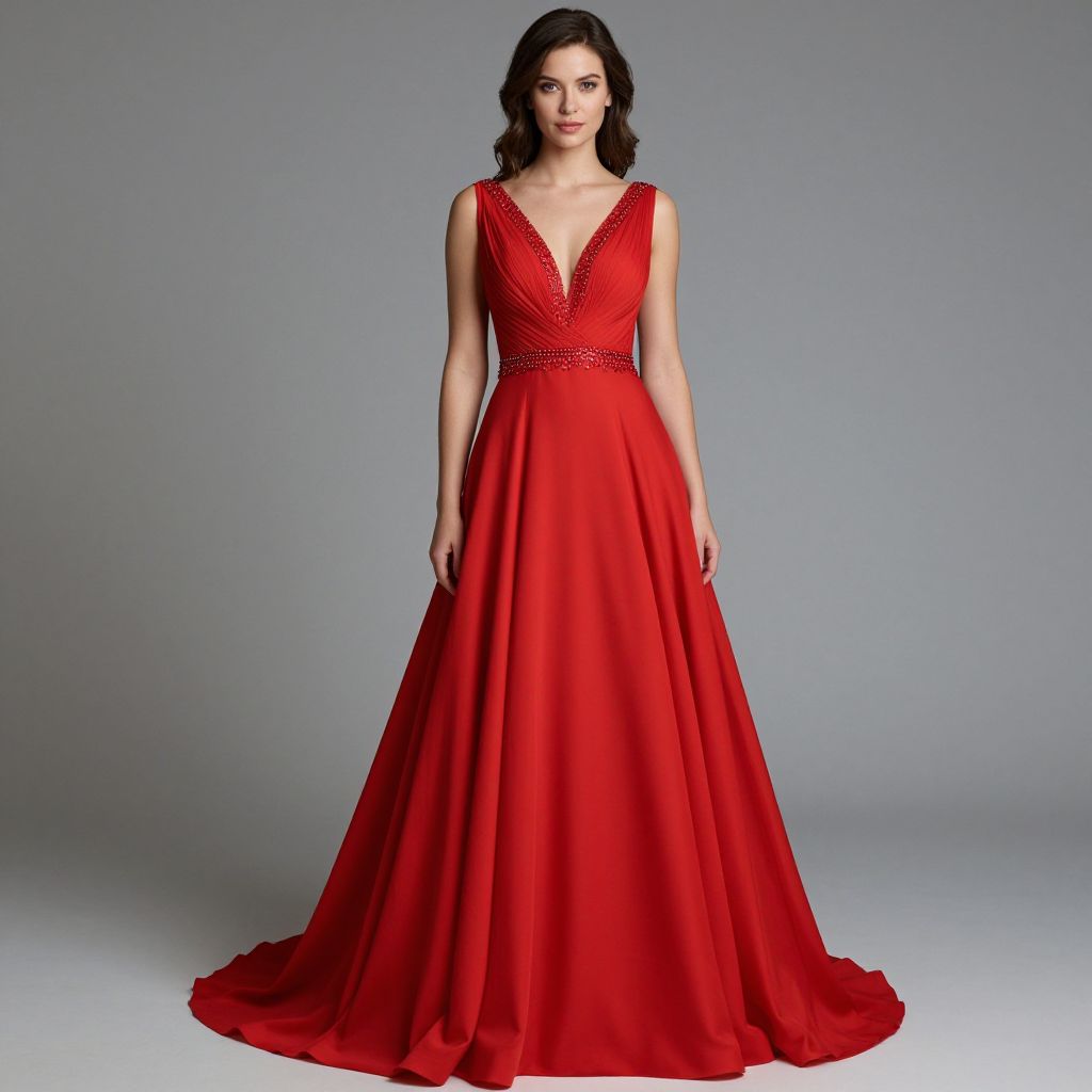 A woman elegantly showcases a vibrant red wedding gown featuring a deep V-neckline adorned with intricate embellishments, a fitted waist highlighted by a delicate beaded belt, and a flowing A-line skirt, embodying the top wedding dress trends captured in high-definition photography for Uptown Girl Fashion Magazine.