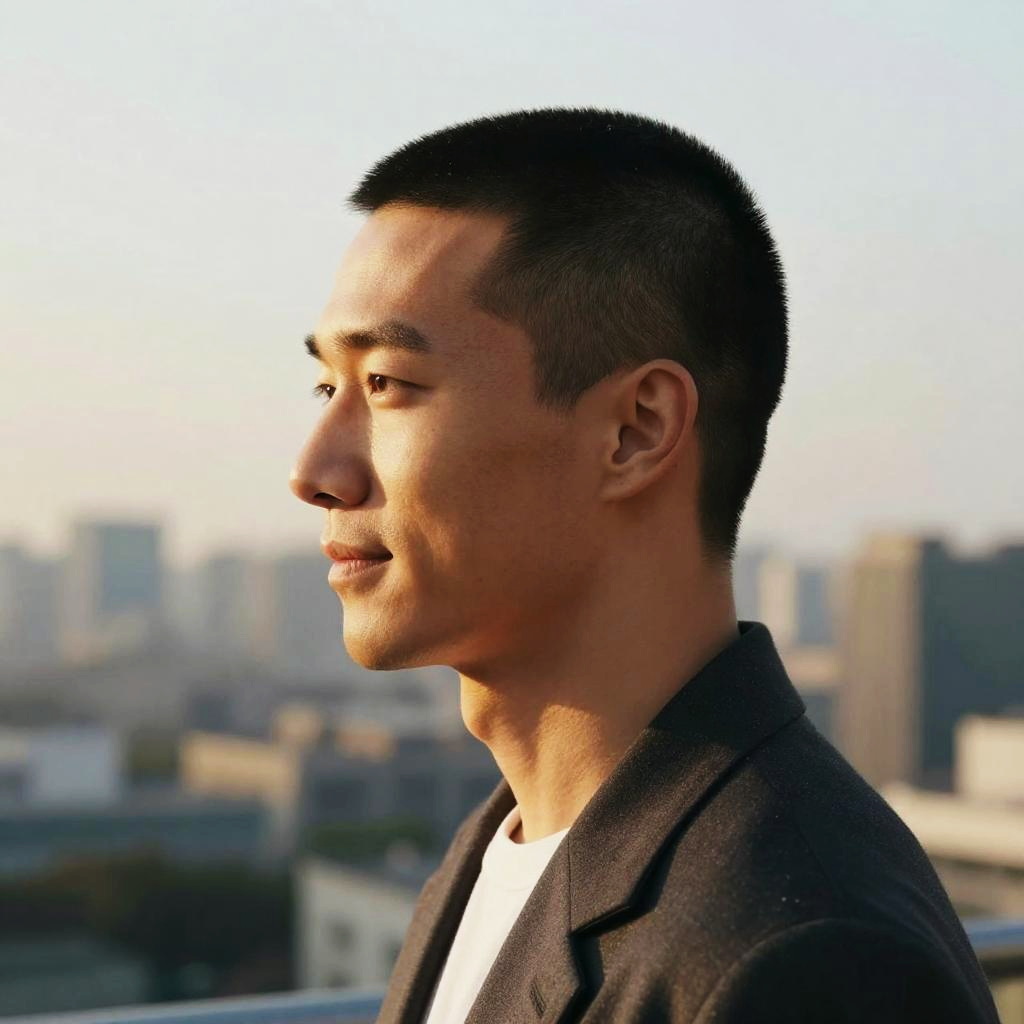 Side profile of an Asian man with a neat buzz cut, soft focus cityscape in background, golden hour lighting, natural skin tones, modern fashionable look, slight smile, highly detailed texture, digital portrait with cinematic mood