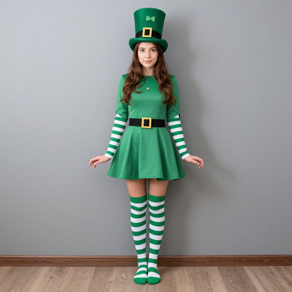 Photograph of a young woman in a green leprechaun outfit with striped sleeves, hat, skirt, and socks, standing against a gray wall