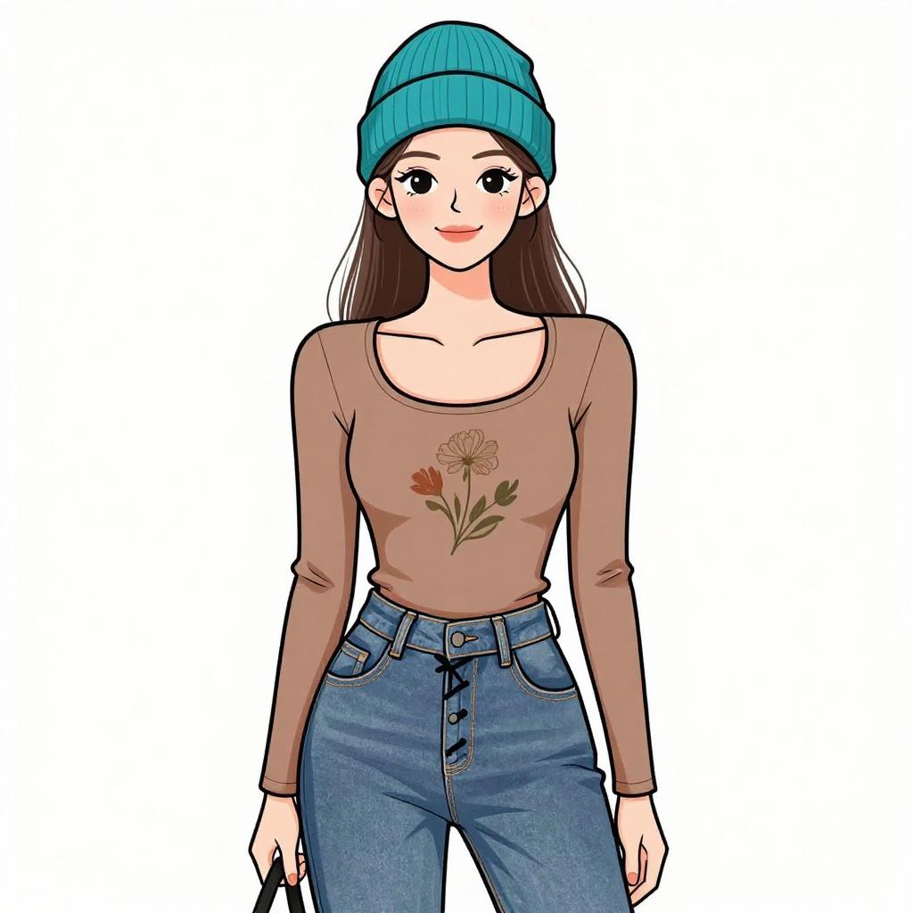 Digital illustration of a young woman with fair skin and long brown hair, wearing a teal beanie, brown long-sleeve shirt with a floral embroidery on the chest, and high-waisted blue jeans. She has large, expressive eyes with long lashes, a small nose, and a slight smile. She holds a black object in her right hand. The background is plain white, making her the focal point. The style is reminiscent of modern, clean-line anime or manga, with bold outlines and vibrant colors.