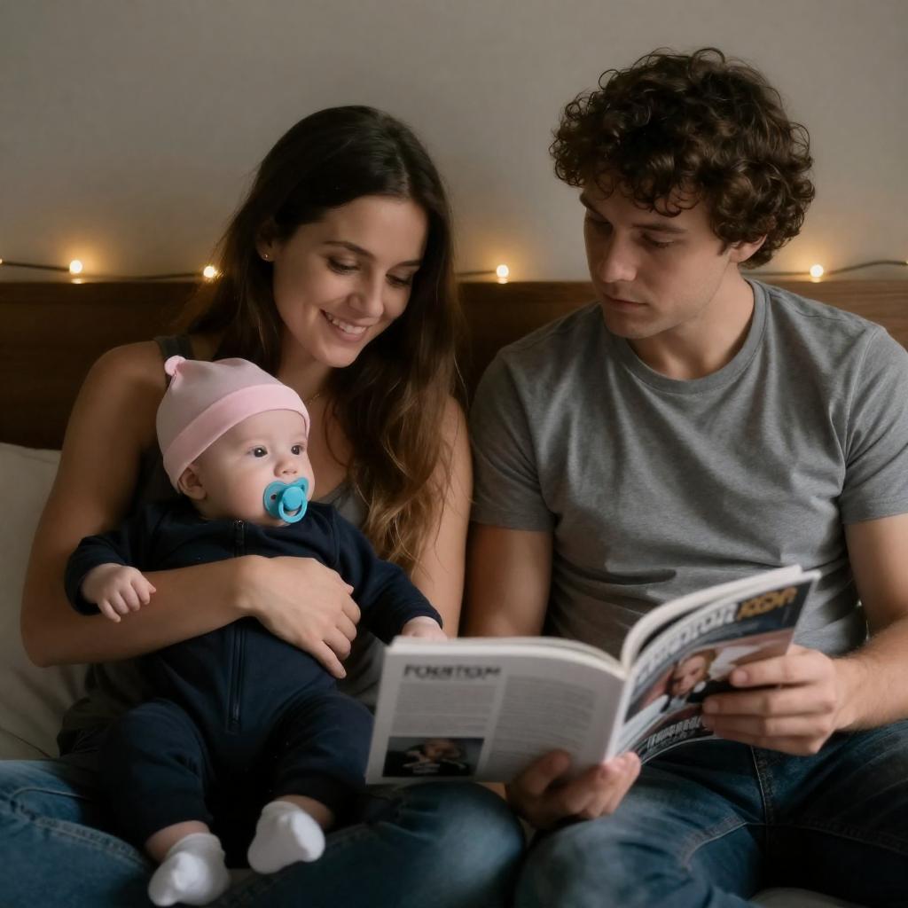 Photograph of a family on a brown couch. A woman with light brown hair in a red cardigan and gray top leans over two girls, one with dark hair and the other with light brown hair. A man with light brown hair and a beard in a black shirt leans over the girls. Soft candles in the foreground. Warm, patterned wallpaper in the background. The girls have downcast eyes, the man looks at the woman. The woman's arm is around the dark-haired girl. The family is closely huddled together.