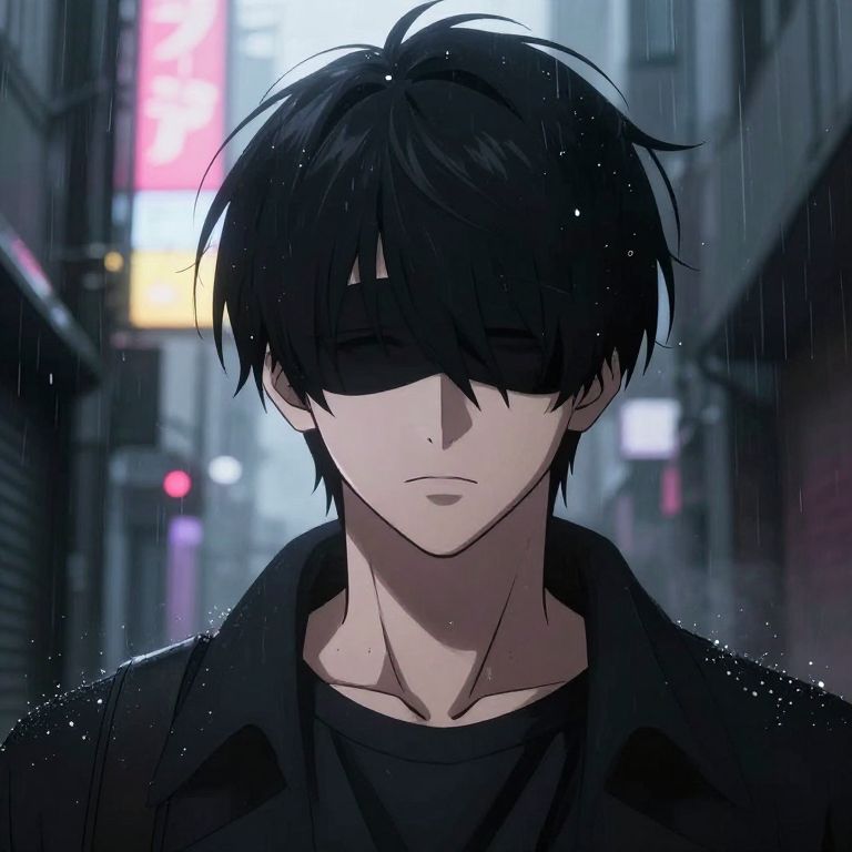Anime male black hair covered eyes, mysterious aura, standing in a dark alley with soft neon lights reflecting, detailed shadows on his face, atmospheric fog, rain drops glistening, dynamic urban background, cinematic lighting, highly detailed anime style.