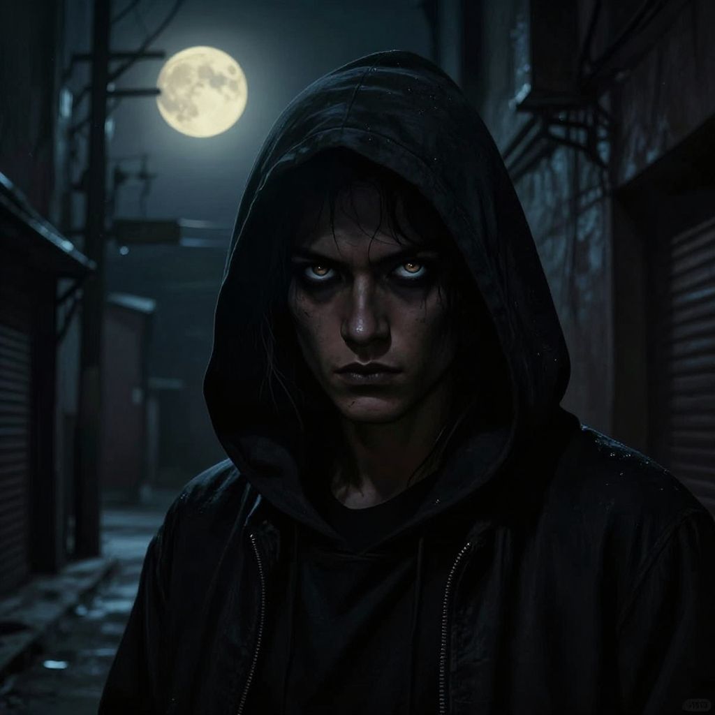 Character portrait, hooded figure, dark alleyway, darkly shadowed face, yellowish full moon, atmospheric lighting, digital painting, intense glowing gaze, mysterious aura, urban setting, highres, dark tones, moonlit night, hooded sweatshirt, professional, lyco art, Keos Masons, intense eyes, moonlit alleyway, intense gaze, dramatic lighting, cinematic composition, urban fantasy, night scene, hooded figure close-up, moonlit atmosphere, haunting, intense atmosphere, dark and moody, highly detailed, ((ominous, eerie, dark shadows), gritty, haunting atmosphere)