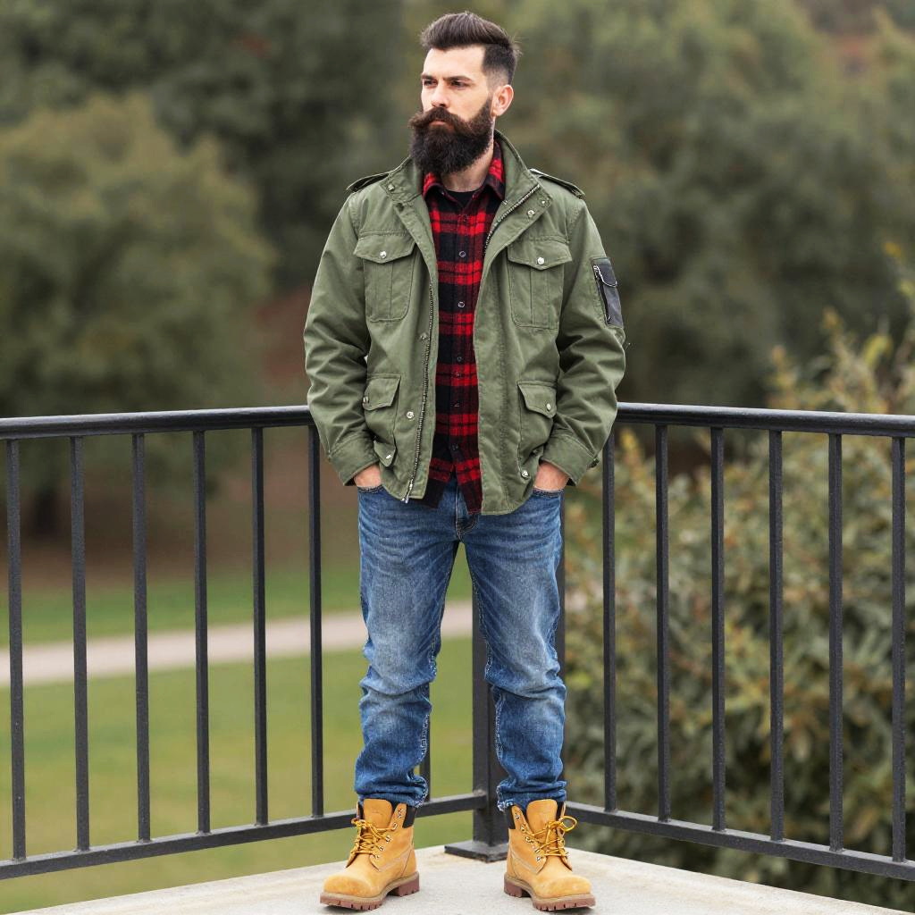 Photograph of a bearded man with dark hair, wearing a green military jacket, red plaid shirt, blue jeans, and tan boots, standing