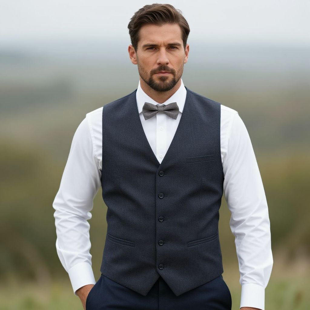 A confident man sports a stylish formal waistcoat, presenting a suave and composed appearance set against the soft backdrop of a natural landscape.